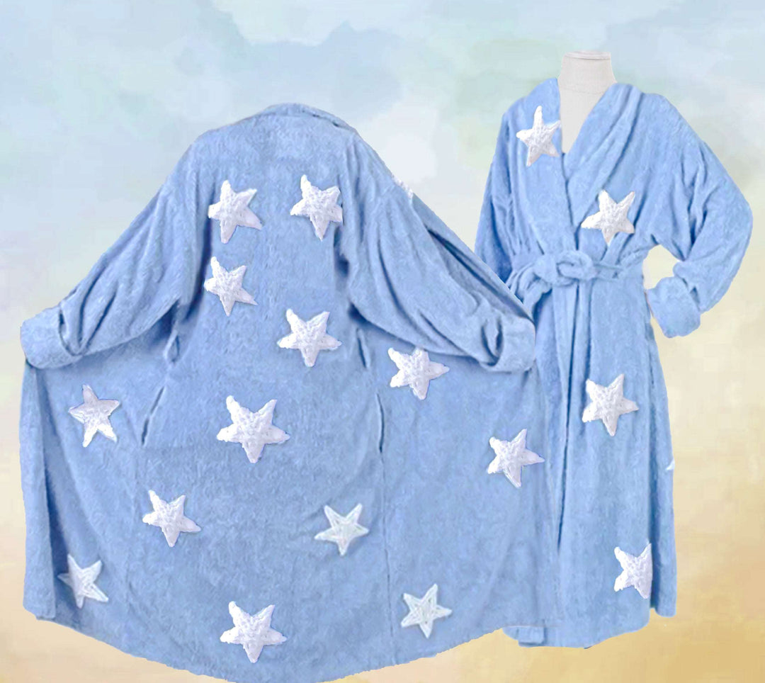 Stay cozy and stylish with our All Stars Robe. Made of soft, high-quality chenille with a unique blue and white star design, perfect for adding a touch of sophistication.