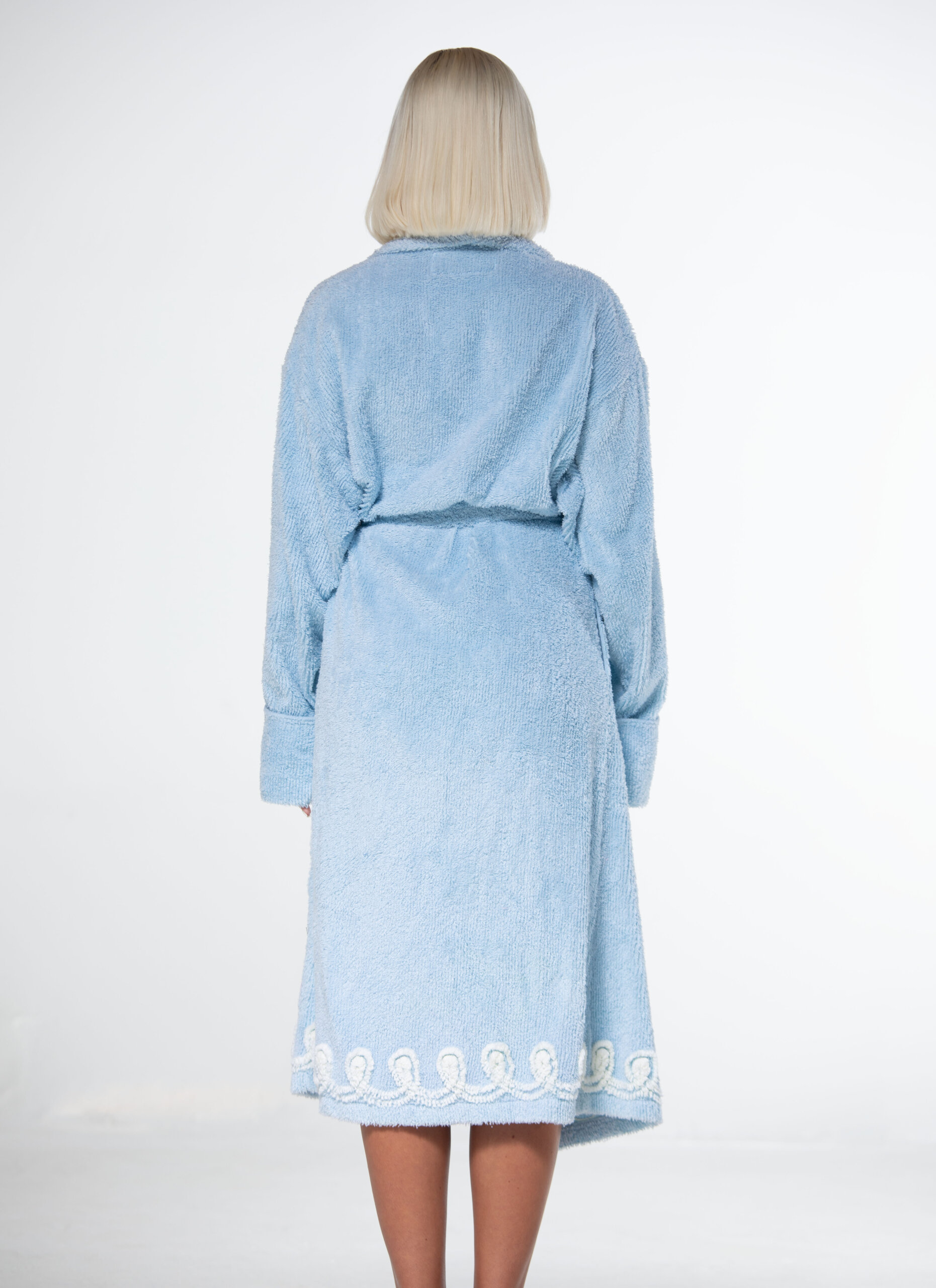 Introducing the Alphabet chenille robe, is a beautiful and elegant lunar blue robe is adorned with white swirls on the collar and along the bottom. Perfect for lounging in style. Hand crafted from chenille. Robe comes with the option of having your initial added.