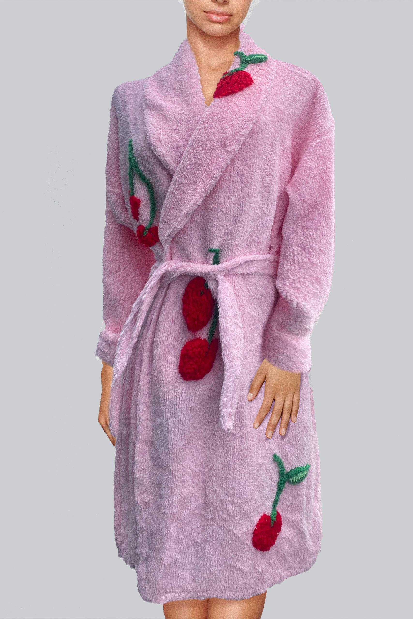 Stay cozy and stylish in our Be Cherry Robe. This luxurious chenille robe features charming cherries embroidered on a beautiful pink or white chenille fabric. Perfect for lounging at home.