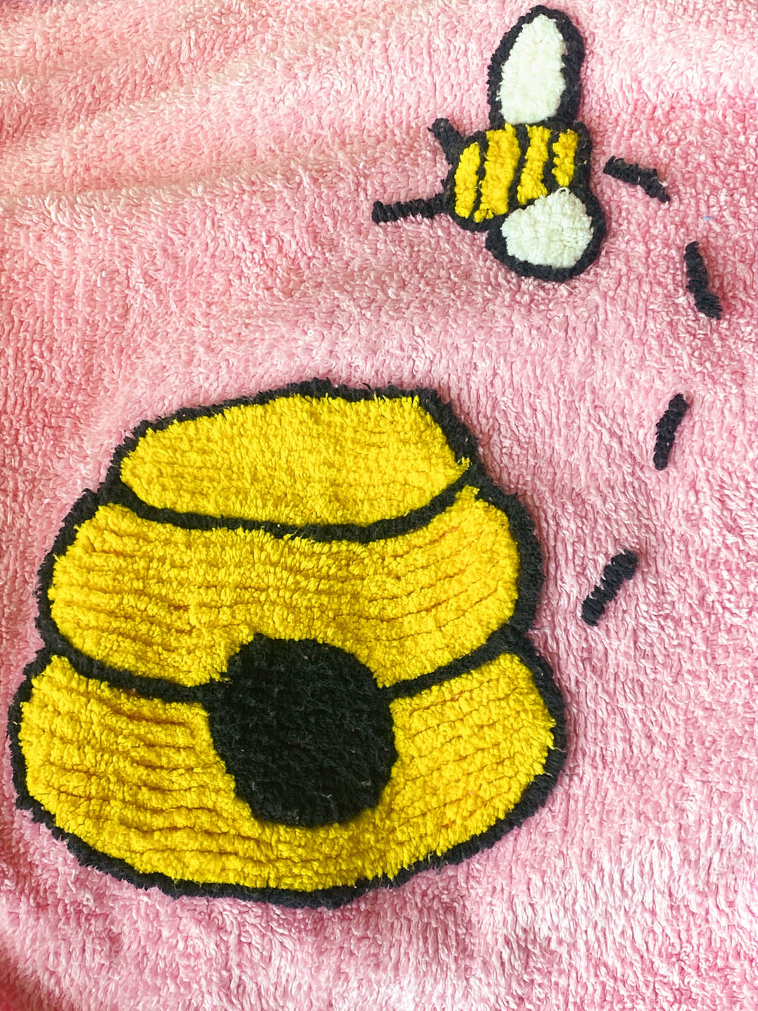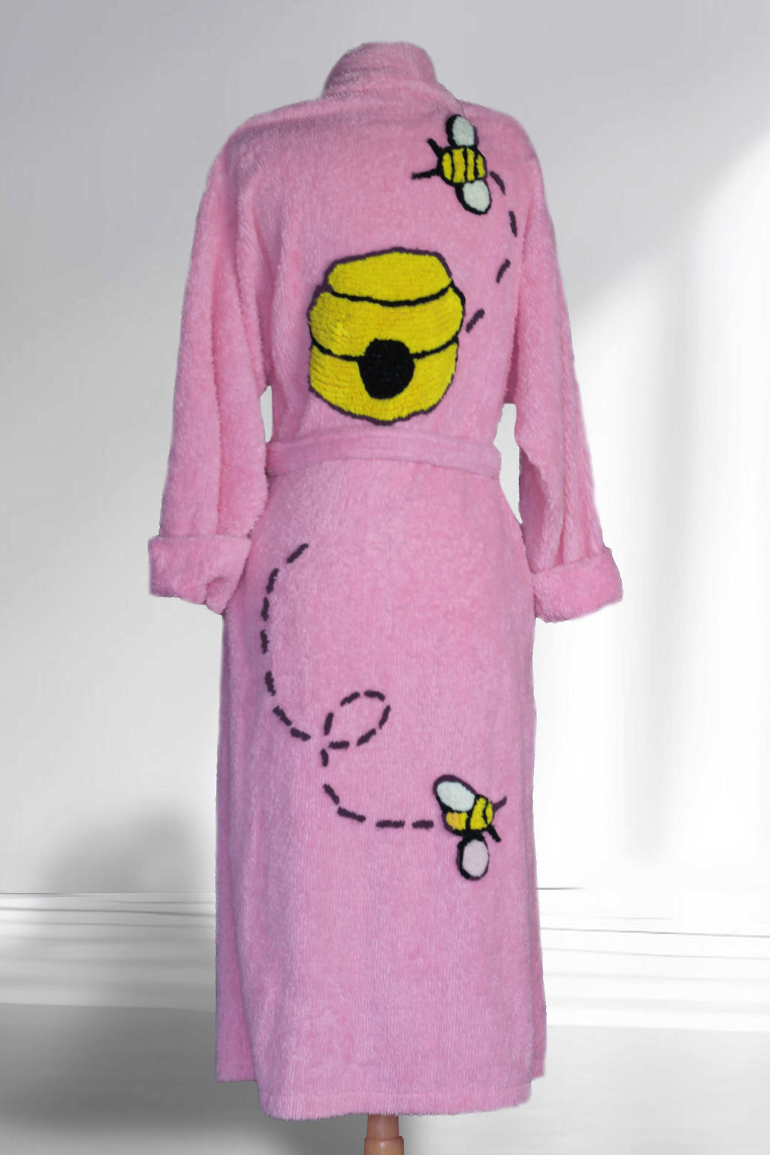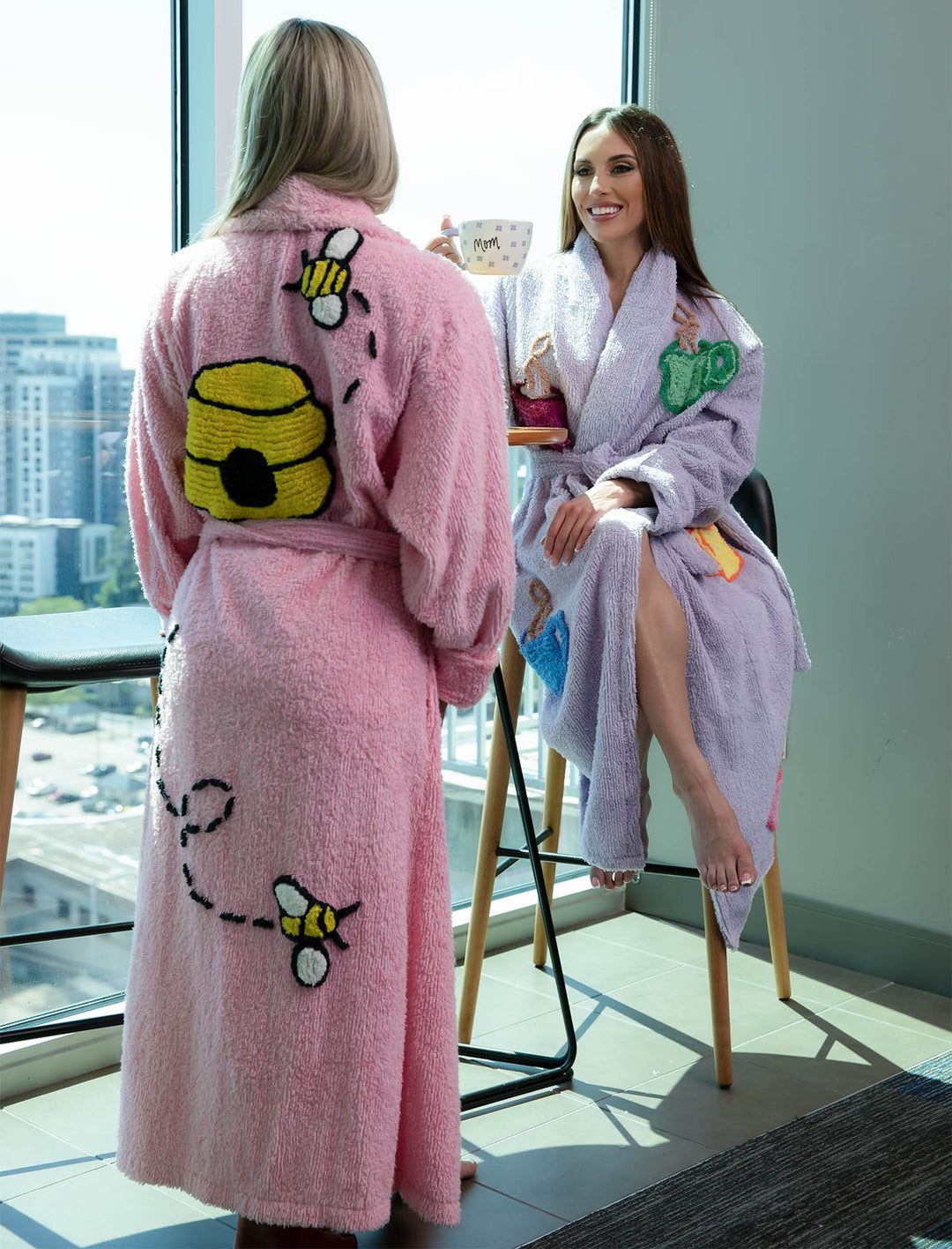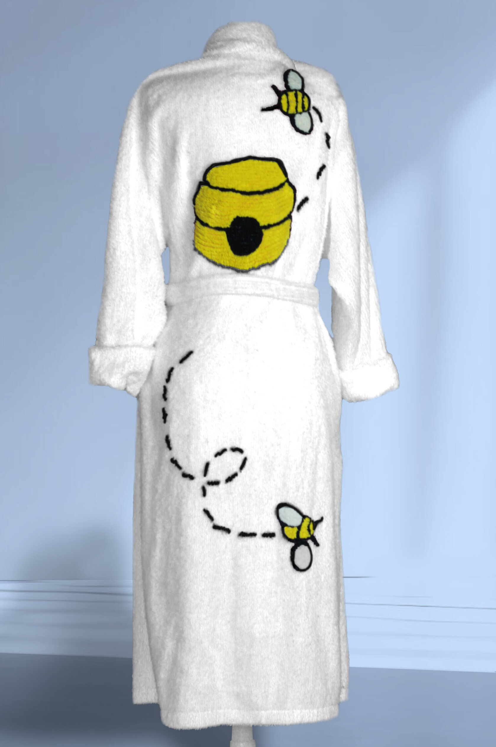 Wrap yourself in our popular Bee Happy Robe. This cozy blue robe features a charming bees and beehive design handcrafted with tufting, complete with a stylish belt. Made from the finest chenille. All robes are hand made.