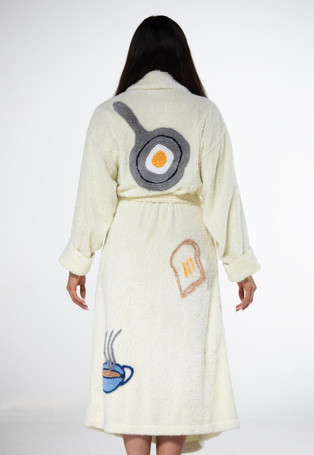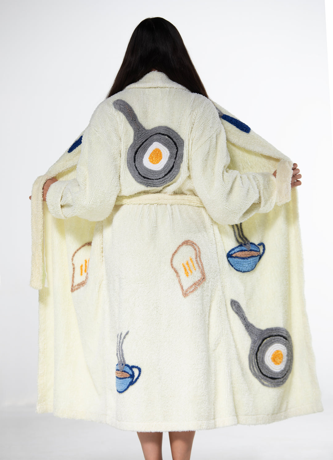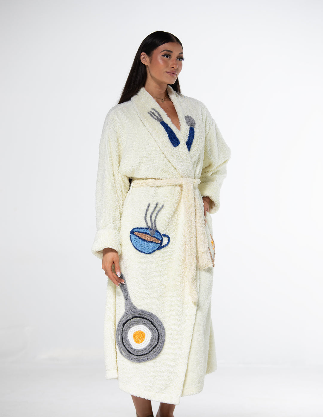 Wrap yourself in our soft and fluffy Breakfast Robe. This cozy light yellow robe features a breakfast design, fork, spoon, frying pan, egg, toast, tea and coffee, handcrafted with tufting, complete with a stylish belt. Made from the finest chenille. All robes are hand made.