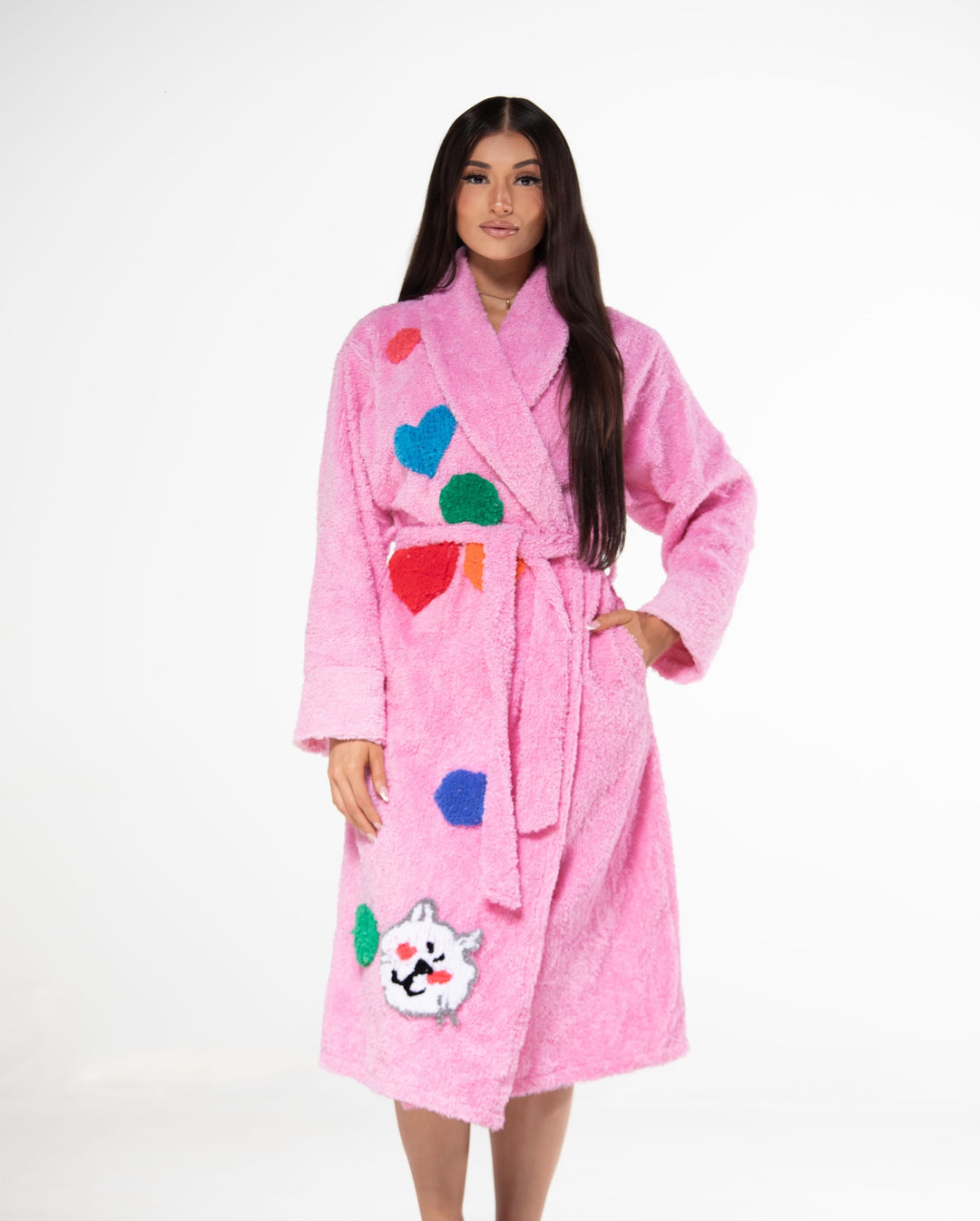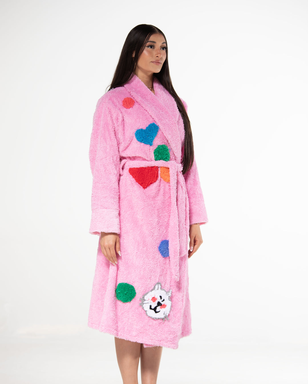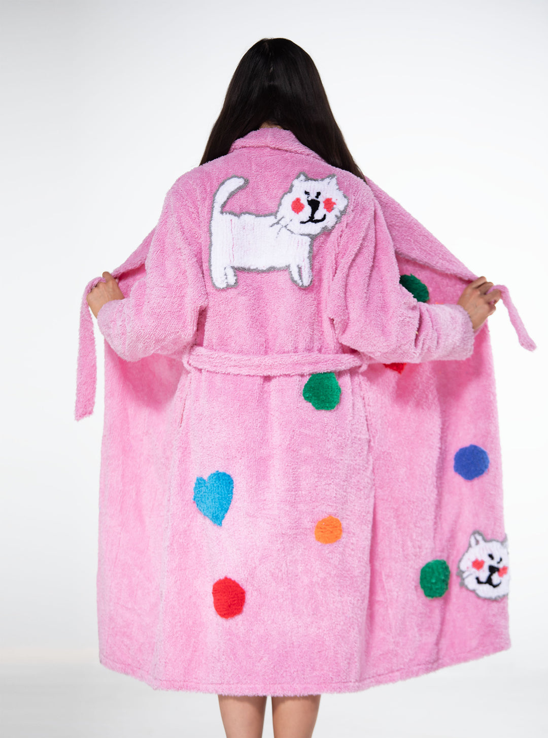Our Confetti Kitty Chenille robe, Made with high-quality chenille and tufting for ultimate comfort and style.Tufting design of a cat with tufting circles and hearts. All designs are hand made