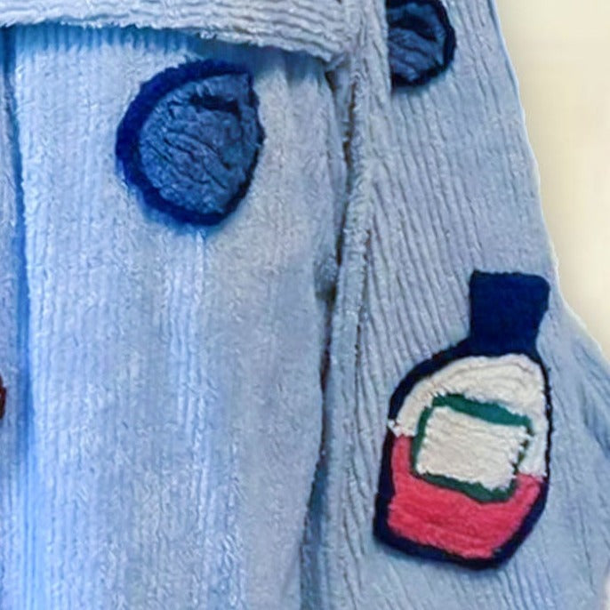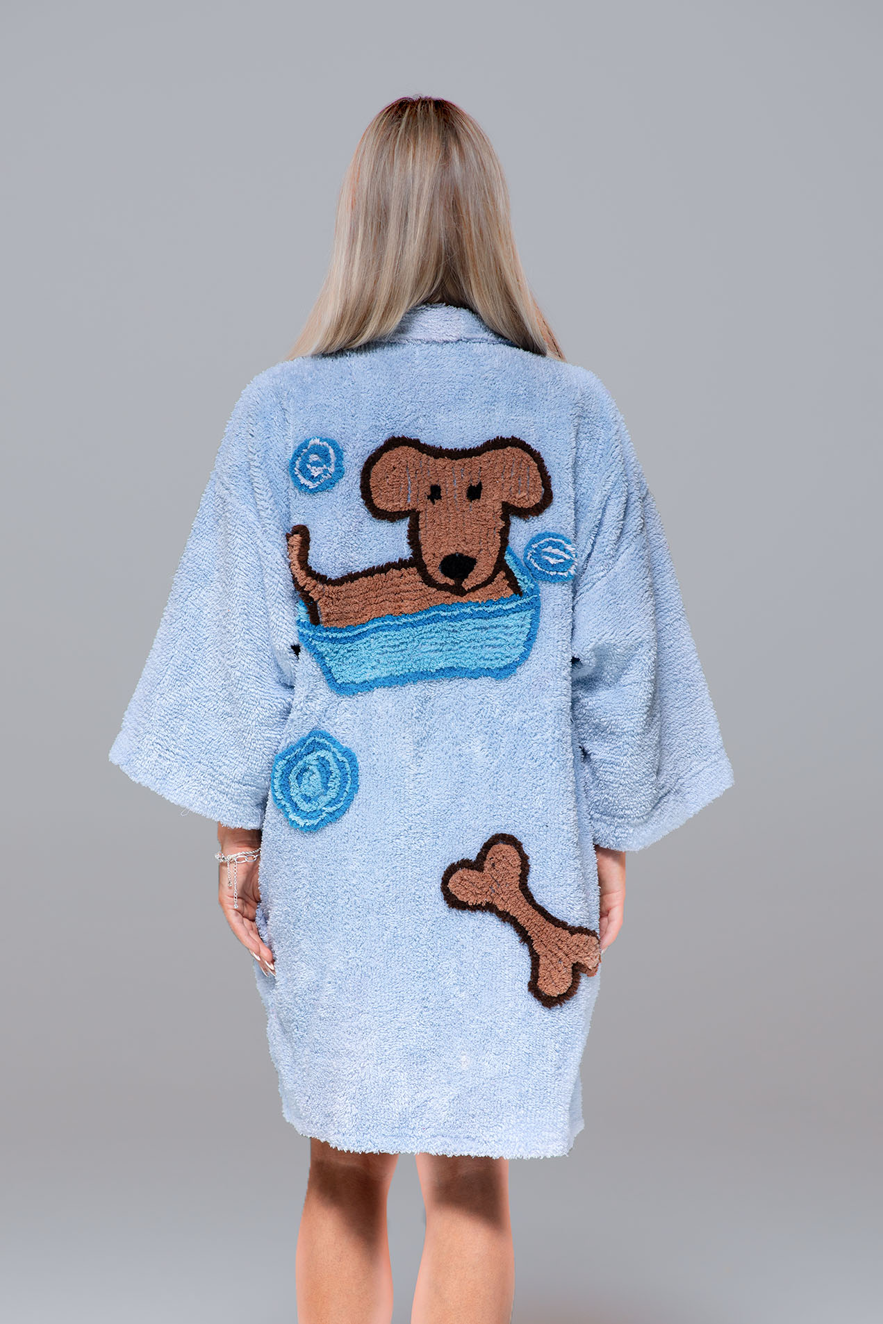 Our Doggie Wash Kimono robe in Lunar Blue, Made with high-quality chenille and tufting for ultimate comfort and style.Tufting design of a dog in a bathtub. All designs are hand made.