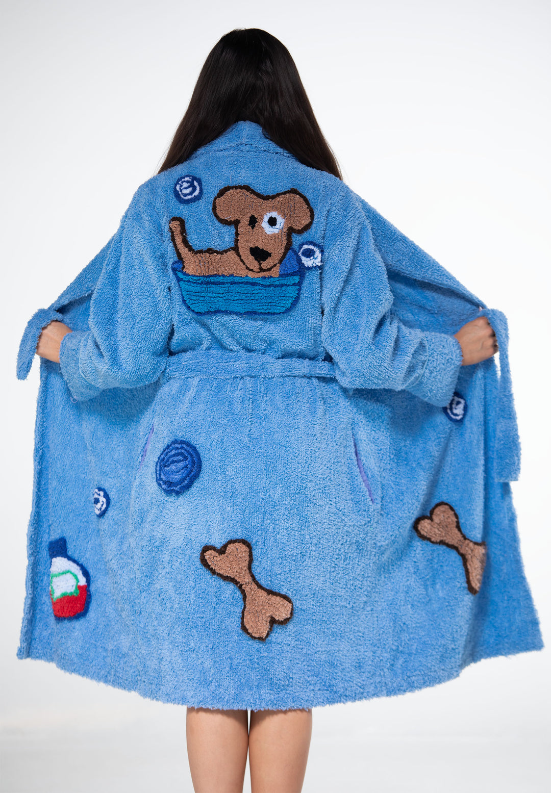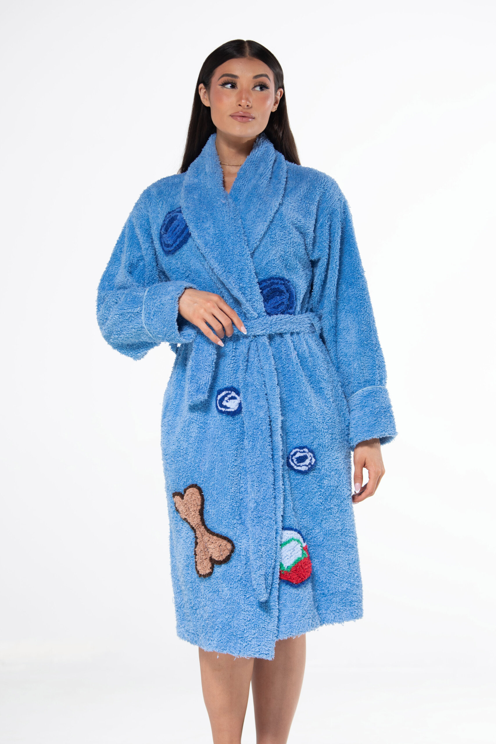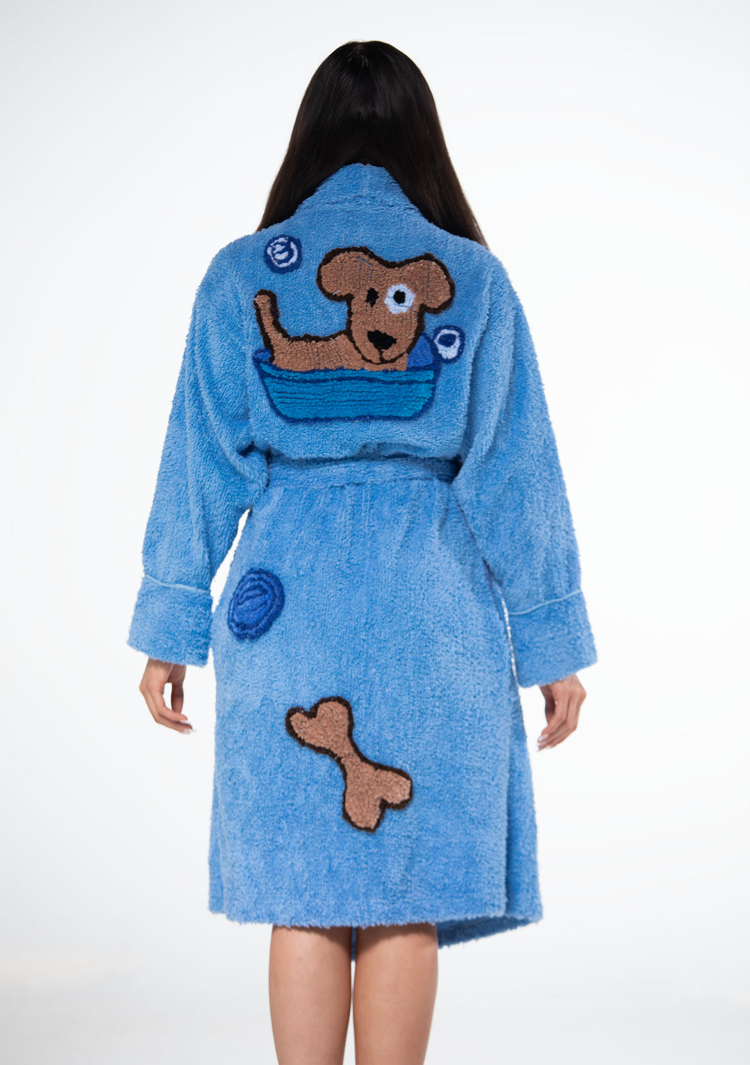 Our Doggie Wash robe, Made with high-quality chenille and tufting for ultimate comfort and style.Tufting design of a dog in a bathtub. All designs are hand made.