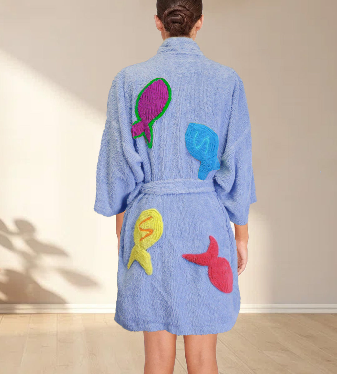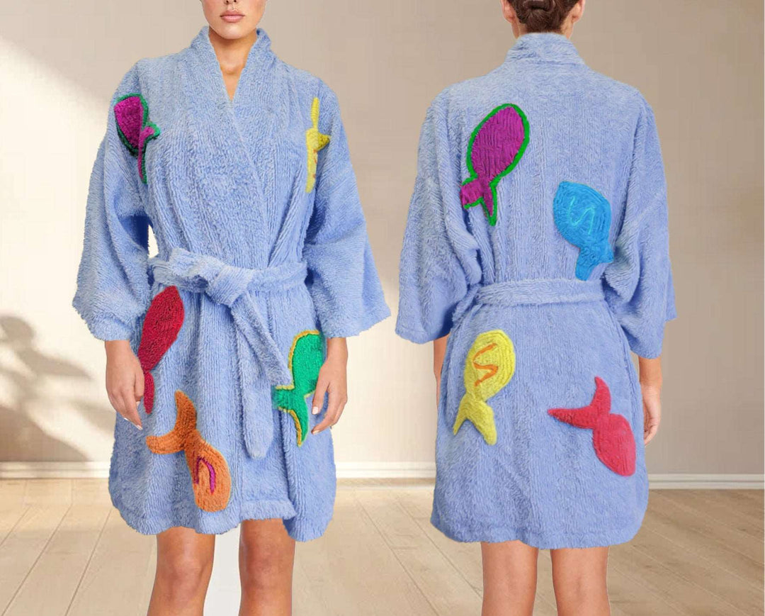 Introducing our Fish Robe Kimono, perfect for the stylish individual who appreciates unique and eye-catching designs. Made with high-quality chenille and tufting for ultimate comfort and style.