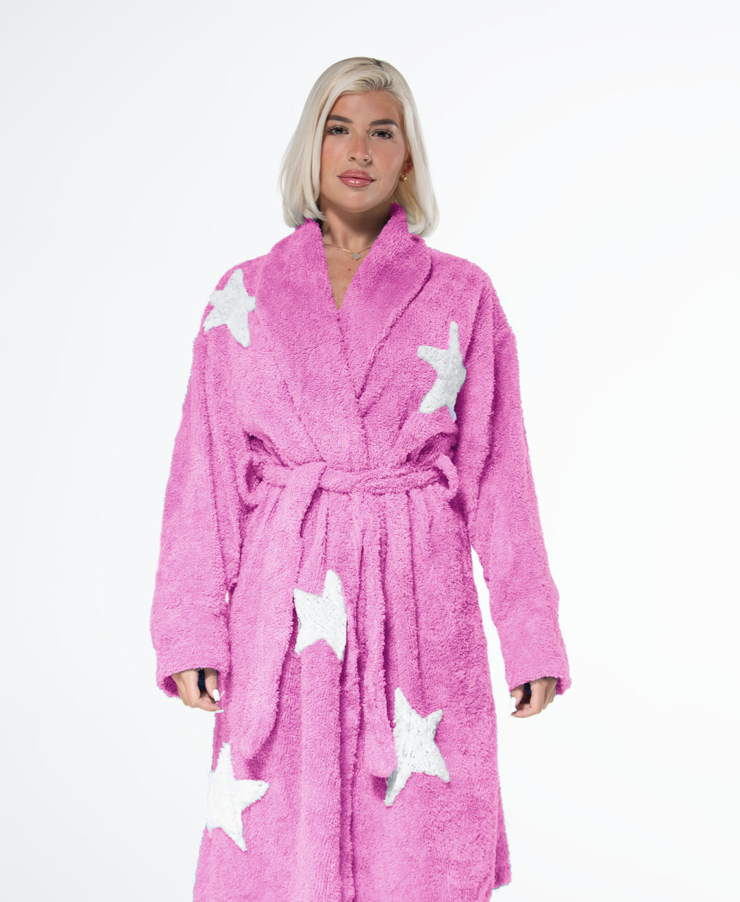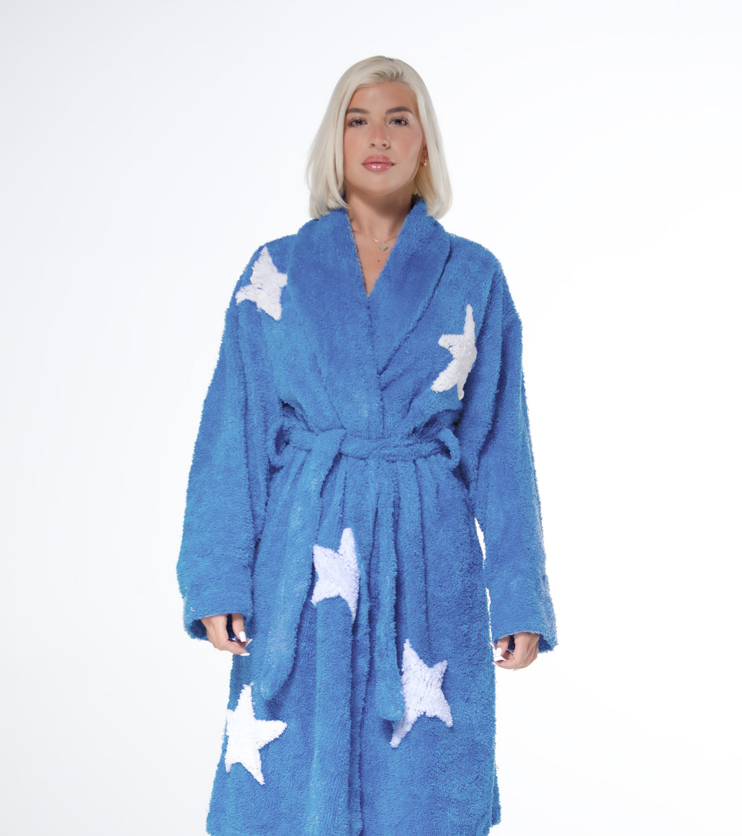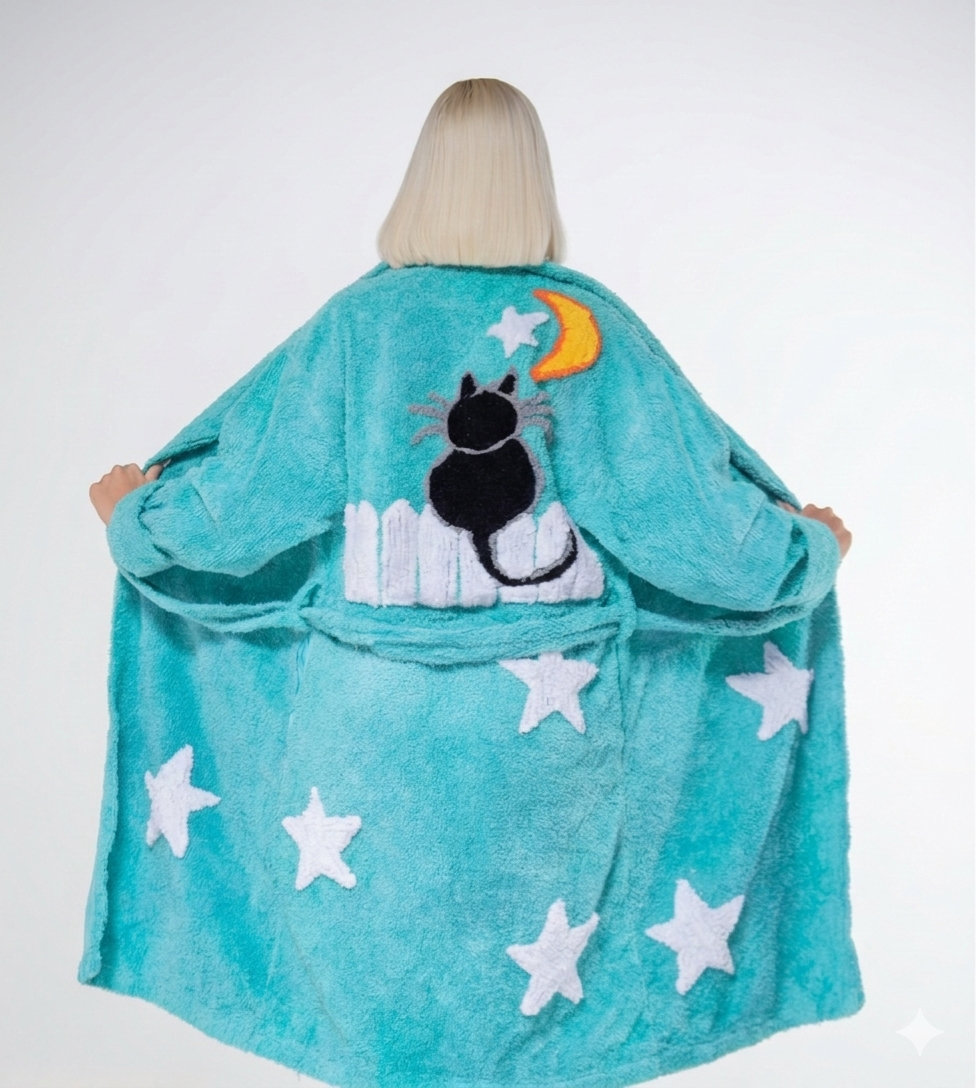 Wrap yourself in celestial elegance with our Kitty Moon Robe! This cozy blue robe features charming design of white stars, a yellow moon and a black cat sitting on a fence, complete with a stylish belt. Made from the finest chenille.