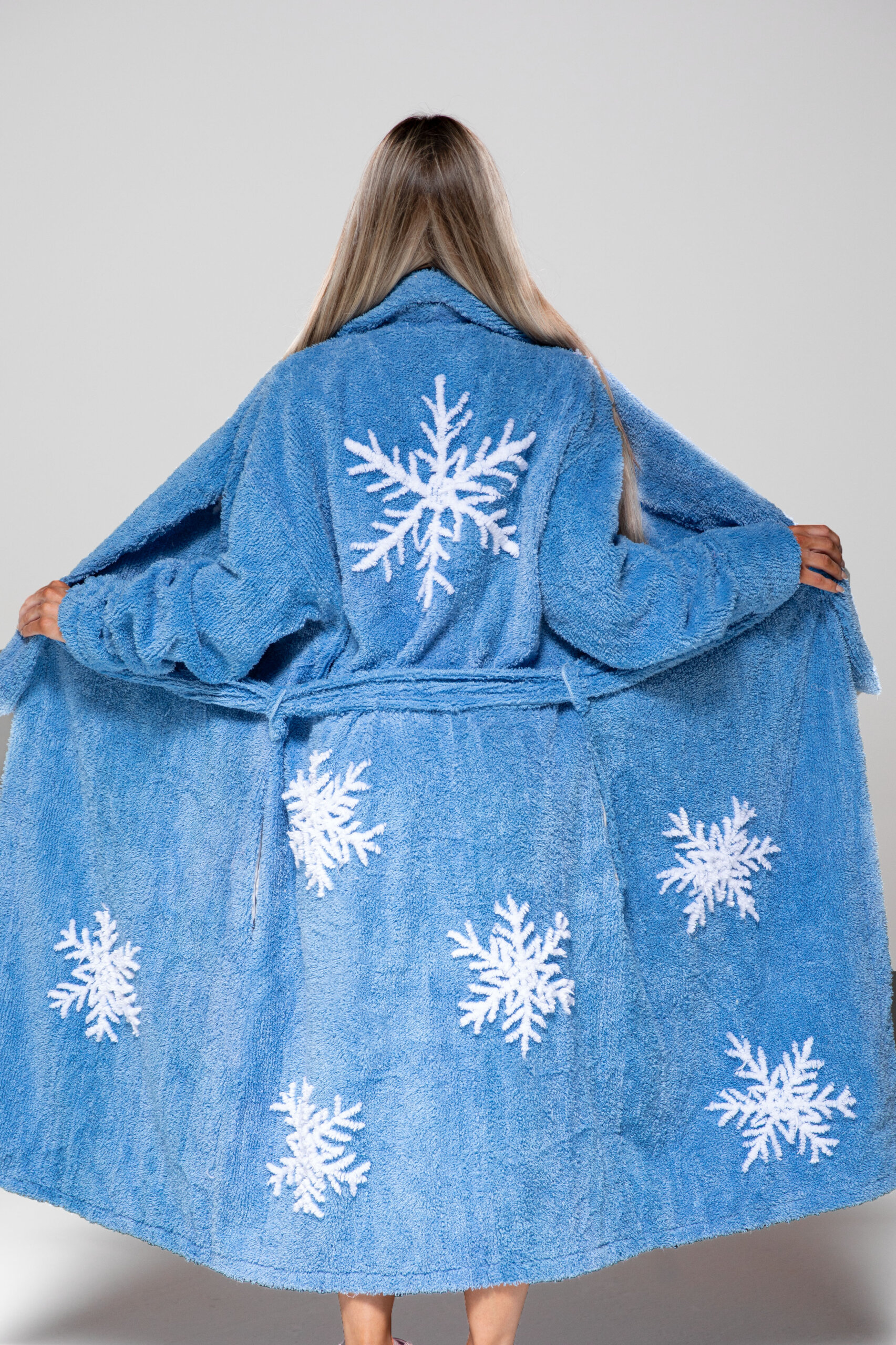 Introducing the Snowflake chenille robe, is a beautiful and elegant bedroom blue robe is adorned with white snowflake designs on the front and back. Perfect for lounging in style. Hand crafted from chenille. Buy now