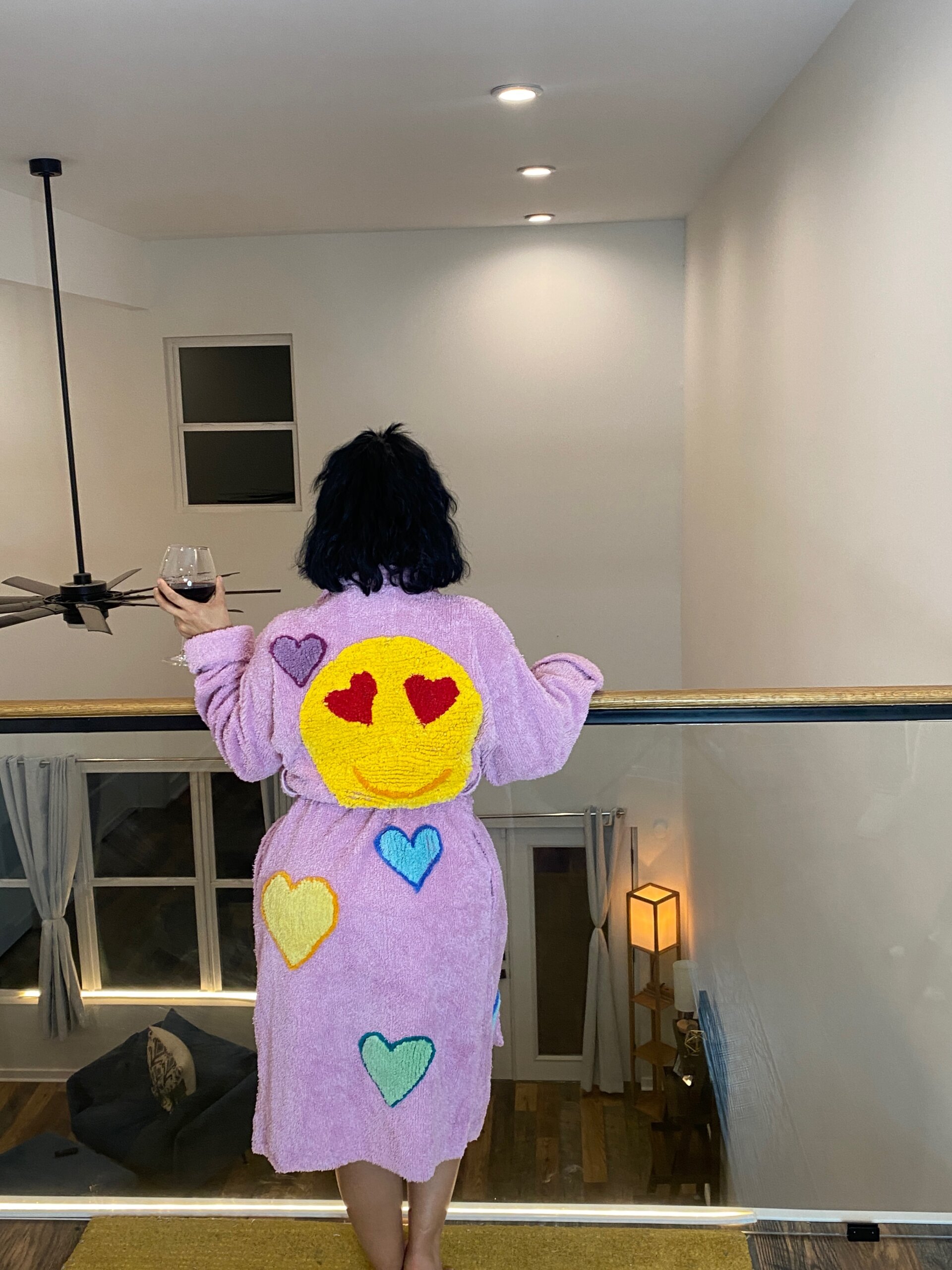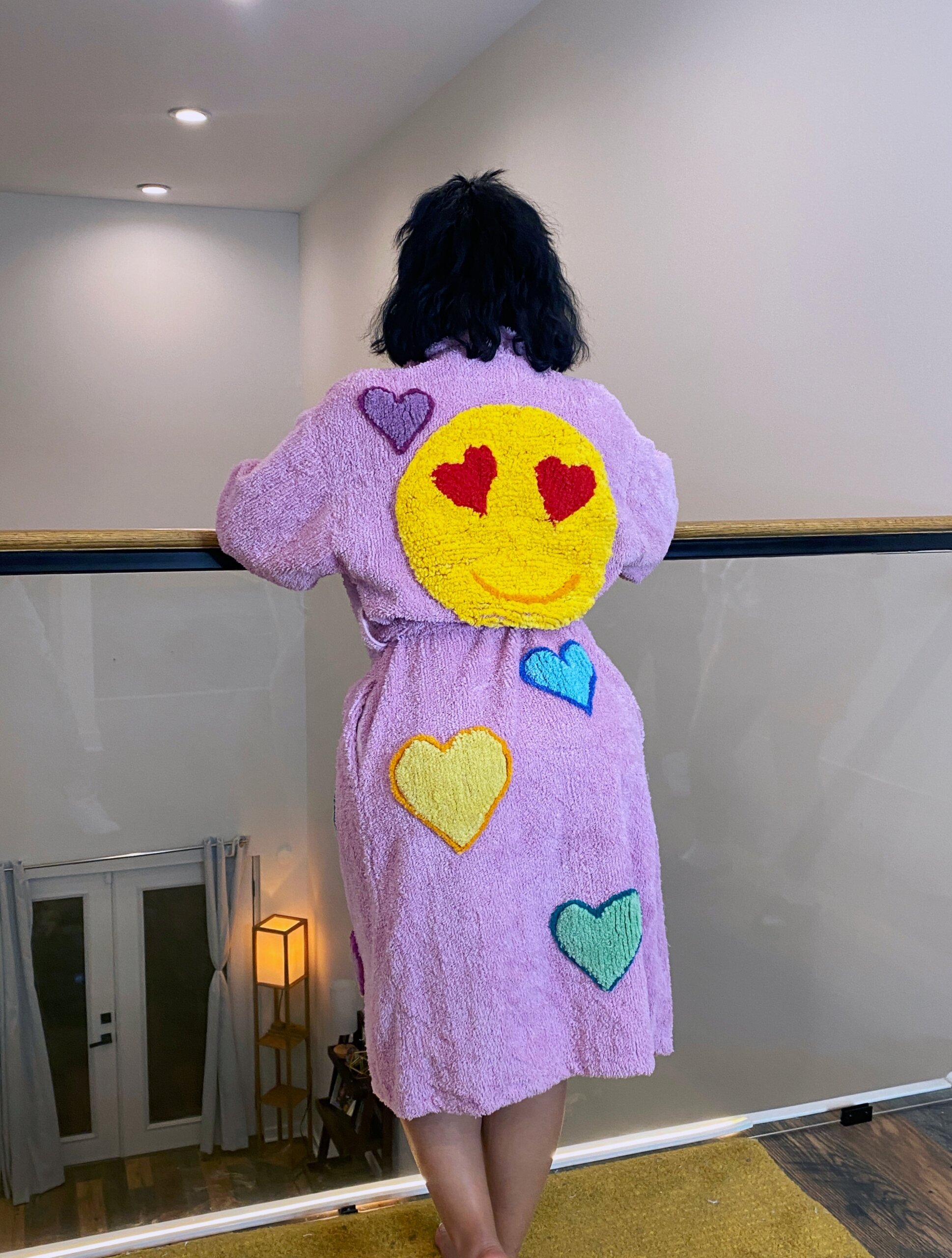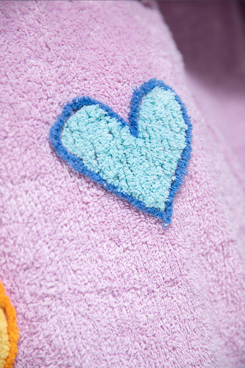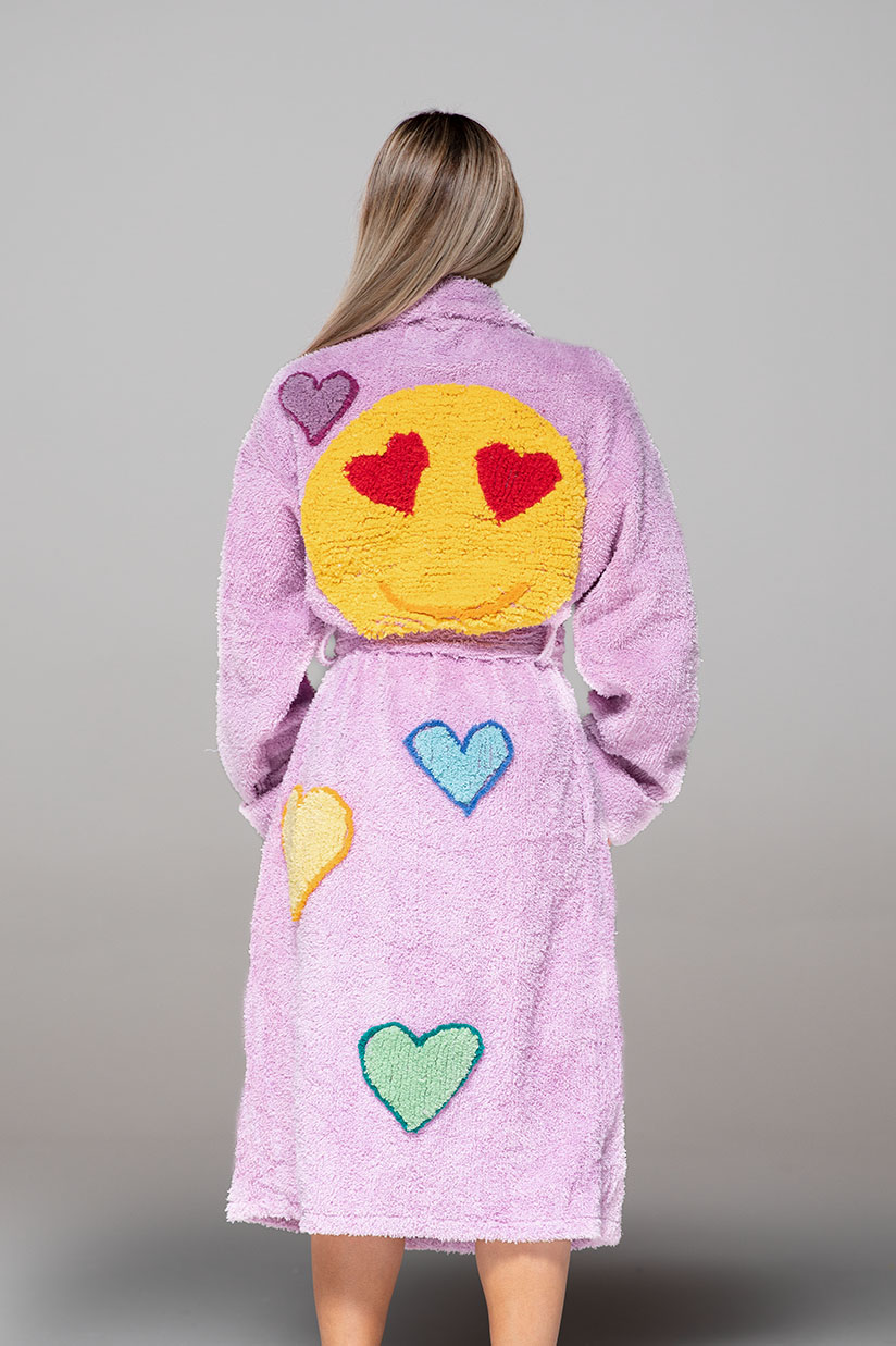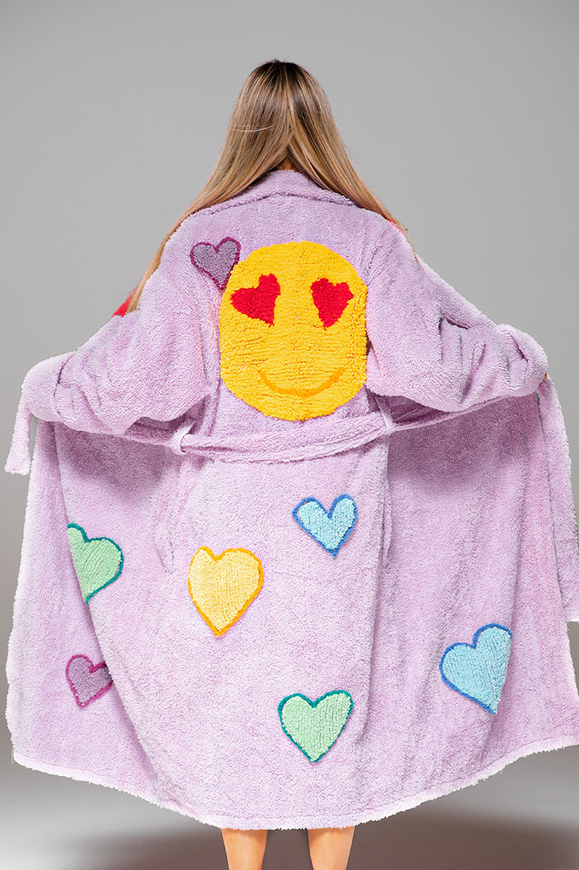 A twist on our fan favorite, our new Struck by Love robe, This beautiful vintage Hearts Chenille robe features a large love struck yellow circle smiling with red hearts ans eyes. Available in multiple colors. Made of soft, high-quality chenille perfect for adding a touch of sophistication.