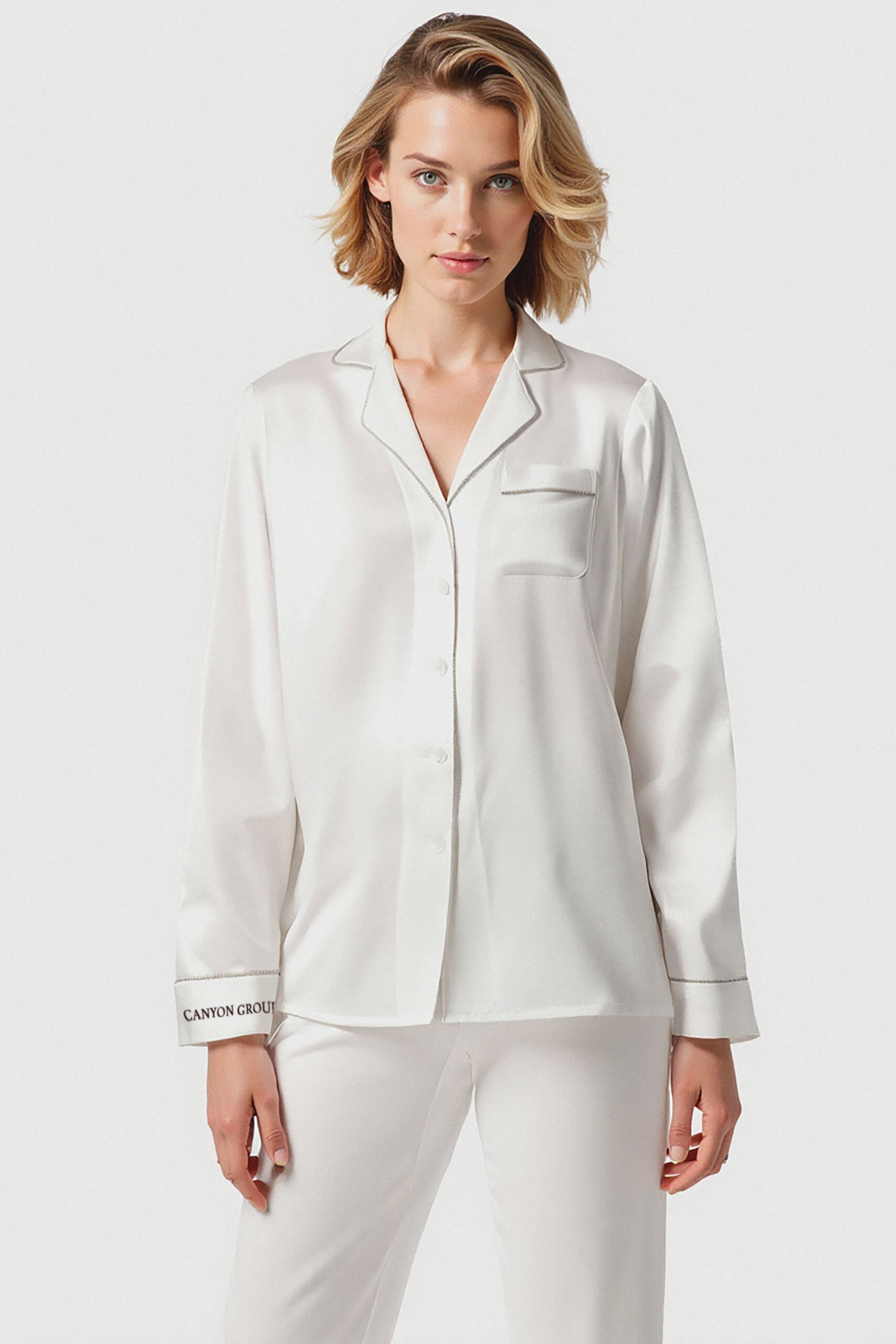 100% washable mulberry silk pajama set. Designed for luxurious comfort. Color ivory white