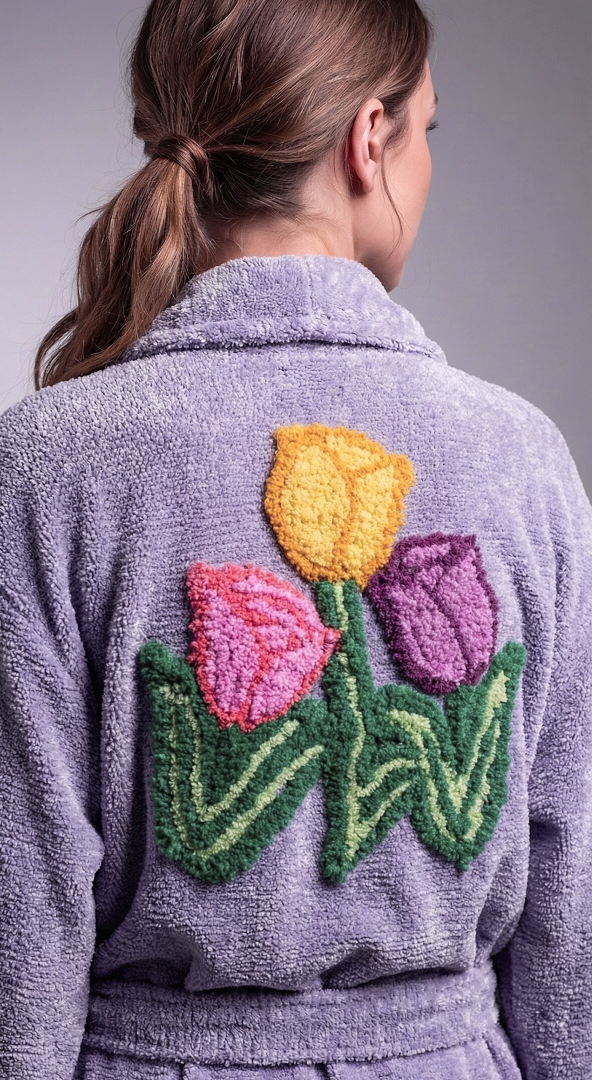 Introducing the Tiptoe Thru the Tulip chenille robe, is a beautiful and elegant green robe is adorned with colorful tulips and a stunning flower design on the back. Perfect for lounging in style. Hand crafted from chenille.
