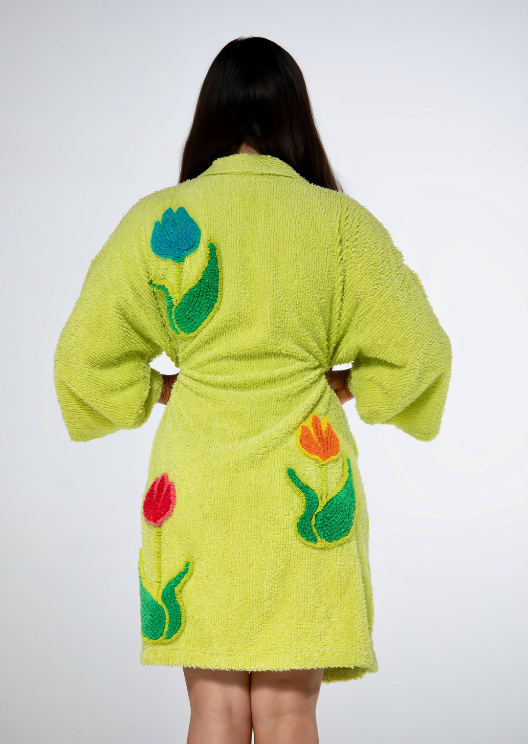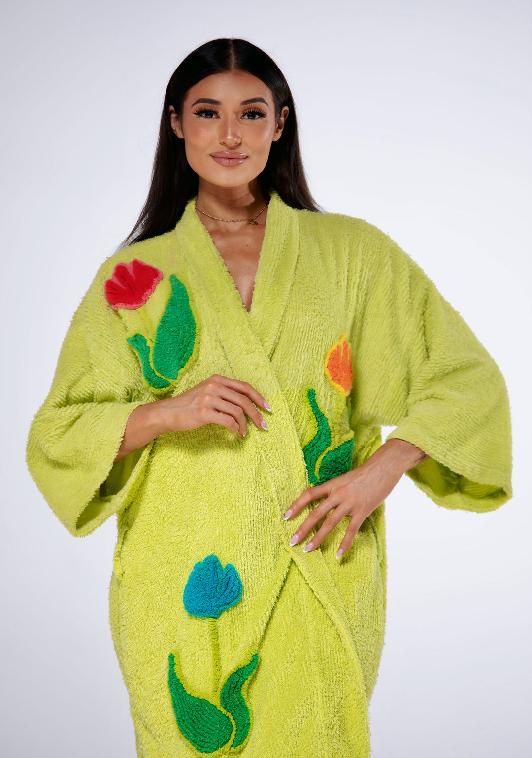 Introducing our Tulip Garden Kimono robe, perfect for the stylish individual who appreciates unique and eye-catching designs. Made with high-quality chenille and tufting for ultimate comfort and style.